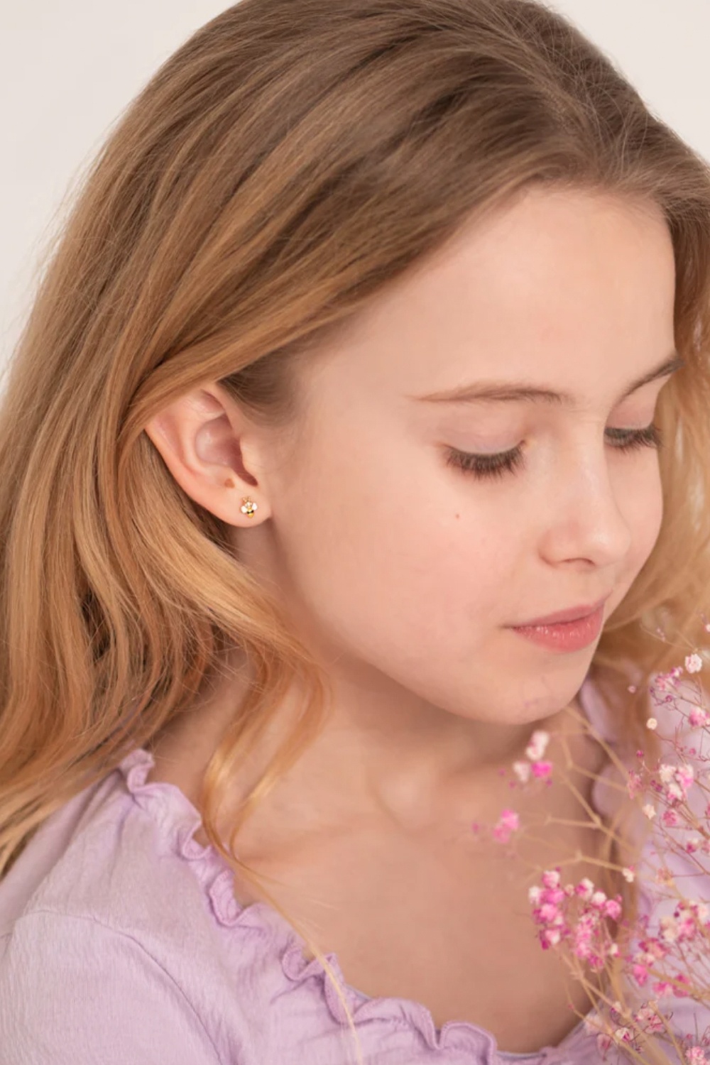 Aceasta pereche adorabila de cercei este realizata din aur galben de 14k si decorata cu email galben si negru, sigur pentru bebelusii cu urechi sensibile.